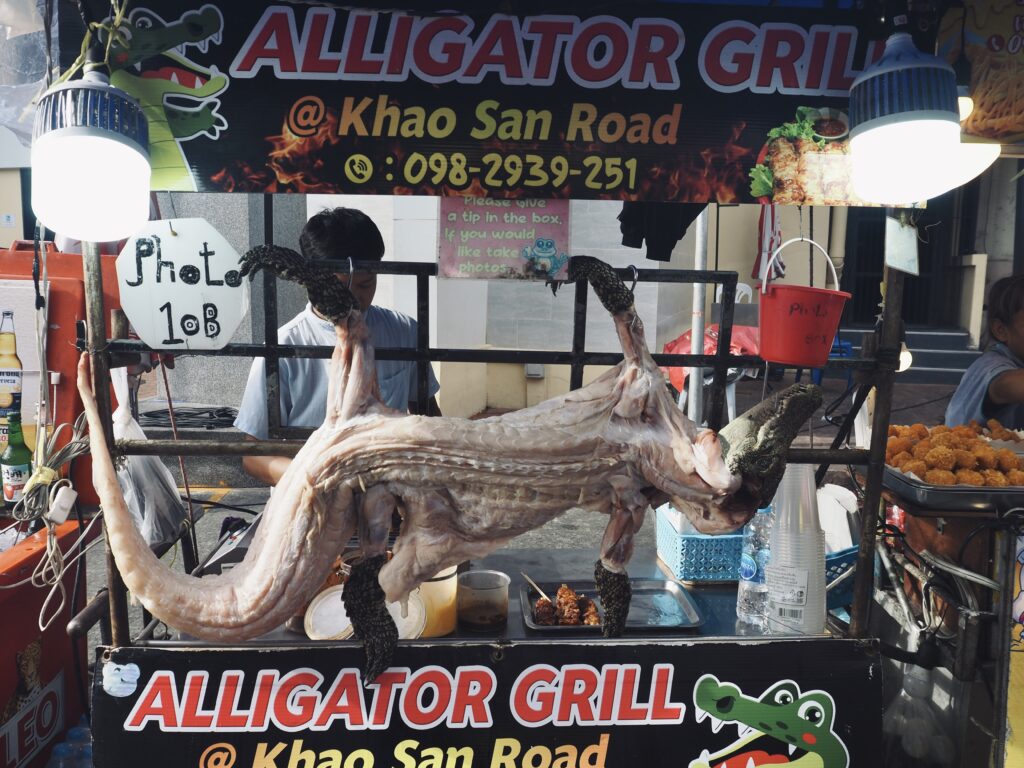 ワニの焼肉を販売している屋台。味は焼き鳥に似ていてかなり美味しく居酒屋のメニューにあるなら私は普通に頼みます。写真撮るなら10Bとか書いてますが、全く気づかずバシャバシャ撮りました。多分買うなら許して貰えます。