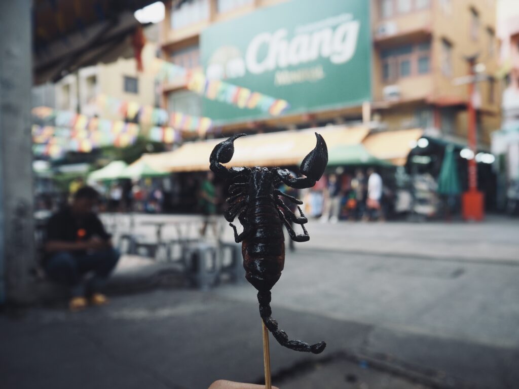 路上でゲテモノのフライを売っていた婆さんから購入したサソリ。他にもヘビやカエルが売ってありました。味はエビ風味ですが、カラッと揚げてあるせいか口の中で粉々になる上、身もなく、美味しくはありません。思い出にはなると思います。