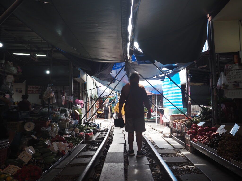 市場の中に線路があり、… いや線路の両際に市場が出来ており、電車が来る度に軒を畳んだり、店前に出していた商品を直し込んだりするという忙しさが醍醐味の観光地です。